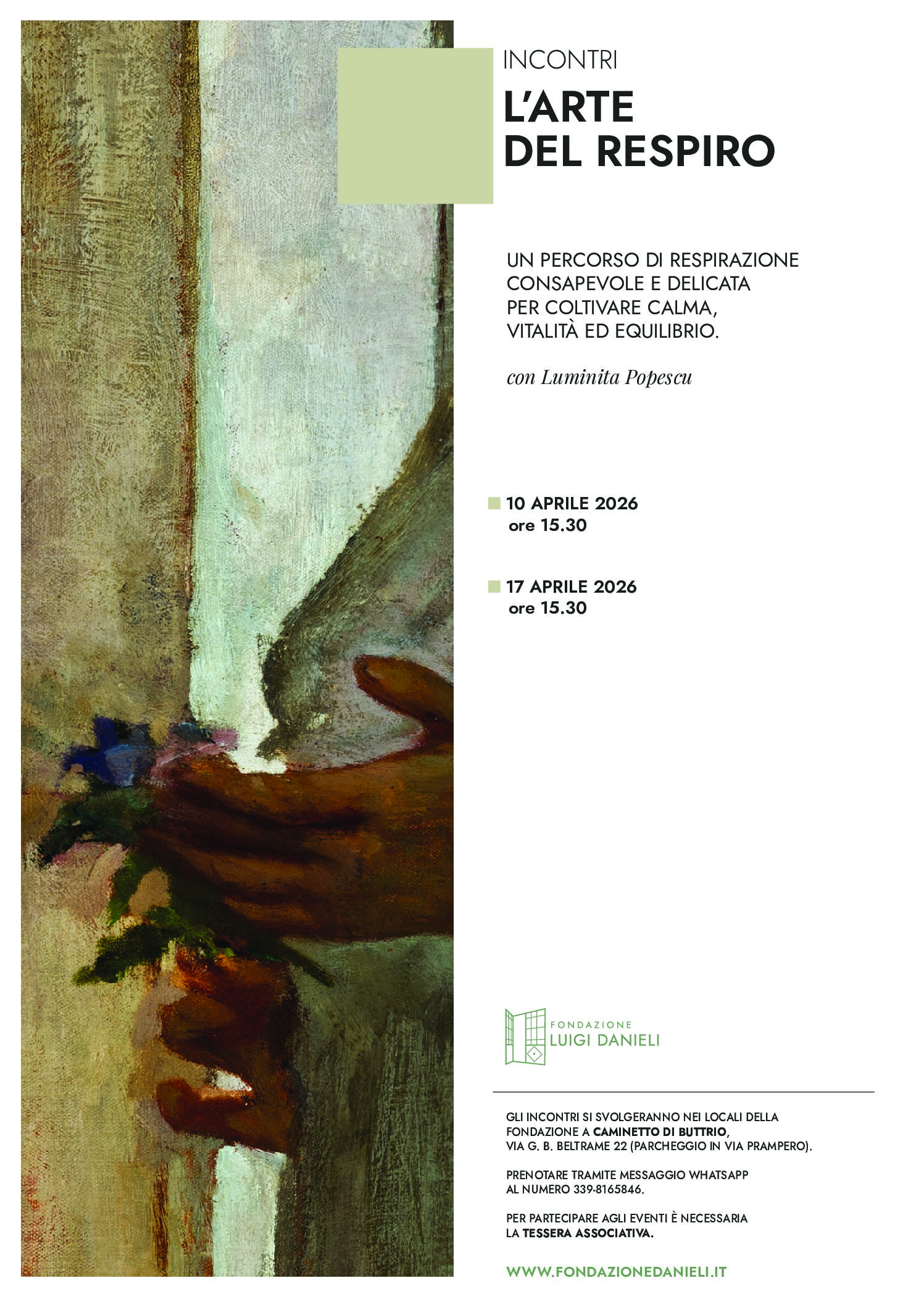 La Fondazione Danieli inaugura un ciclo di incontri fuori programma nel mese di aprile, dedicato a migliorare il benessere generale attraverso la respirazione: L’arte del respiro è un percorso di respirazione consapevole e delicata, creato per coltivare calma, vitalità ed equilibrio. I due incontri si terranno venerdì 10 aprile e venerdì 17 aprile, sempre alle 15.30.