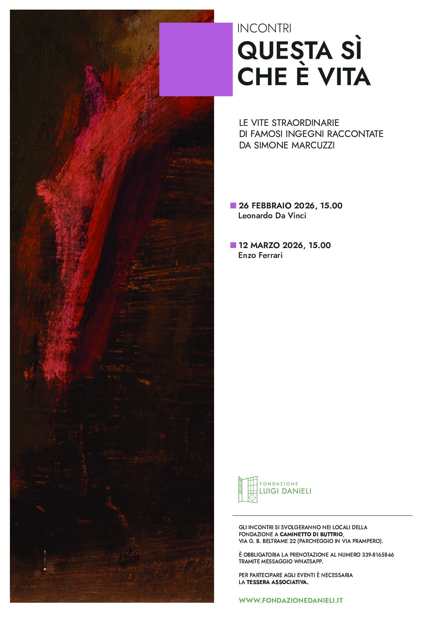 C’è un filo sottile e potentissimo che unisce alcuni uomini eccezionali: è la tensione instancabile verso il fare, il creare, l’immaginare. È l’ingegno che si fa azione, sogno, impresa. La Fondazione Danieli è lieta di presentare il ciclo di incontri Questa sì che è vita, in cui lo scrittore Simone Marcuzzi ci conduce dentro le vite di due grandi protagonisti del pensiero e della tecnica: Leonardo da Vinci ed Enzo Ferrari.