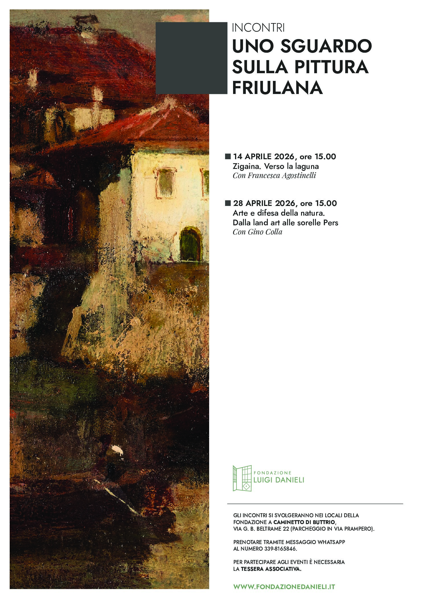 Martedì 14 aprile 2026, alle ore 15.00, ad aprire il percorso sarà Francesca Agostinelli con Zigaina. Verso la laguna: un’immersione nel mondo di Giuseppe Zigaina, nelle sue atmosfere sospese e nei paesaggi che sembrano respirare memorie antiche. Un modo per avvicinarsi al suo rapporto con la natura, con il silenzio, solcando quel confine sottile tra realtà e mito che attraversa la sua opera.