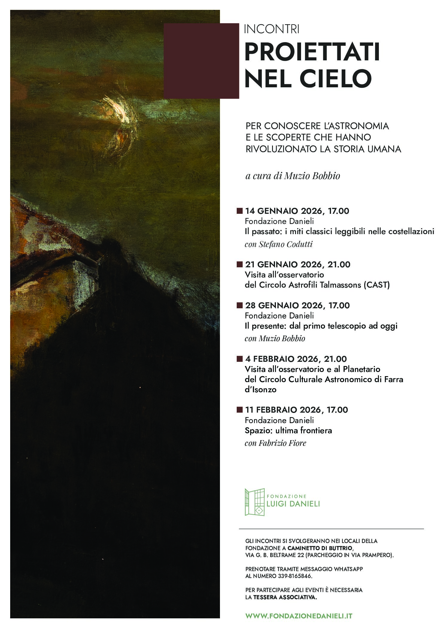Proiettati nel cielo è un ciclo di incontri che intende avvicinare all’astronomia, agli strumenti di osservazione e a quelle scoperte che hanno rivoluzionato l’esistenza umana. Dalle civiltà più antiche fino ai giorni nostri, un fascino misterioso richiama l’uomo all’osservazione del firmamento. I corpi celesti, le stelle, il Sole, la Luna e tutti i fenomeni loro connessi hanno ammaliato il desiderio umano e le forme dell’immaginazione fino a fare del cielo la sede del divino, un luogo in cui fosse possibile scorgere i misteri della sorte e del destino.
