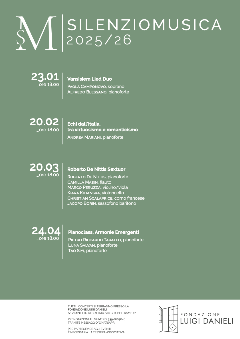 A chiudere la stagione, il 24 aprile 2026 alle ore 18.00, Pianoclass, Armonie Emergenti: una due giorni di residenza dedicata ai giovani musicisti (Luna Salvan, Tao Siyi, Pietro Riccardo Tarateo), che culminerà in un concerto finale. Un appuntamento che incarna lo spirito della Fondazione verso i giovani talenti: sostenere il momento in cui il futuro sale sul palco, con l’energia e il coraggio delle prime volte.